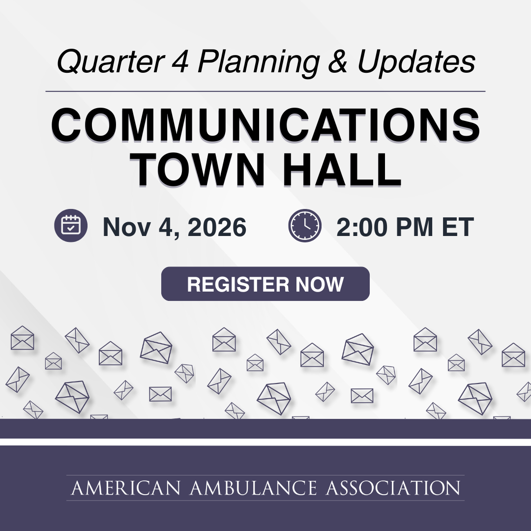 Join the American Ambulance Association Communications Quarterly Town Hall focused on the fourth quarter of 2026, designed to help you close out the year. We’ll review end-of-year strategic dates, communications opportunities, and planning considerations for the coming year. The session will also feature expert speakers discussing current hot topics impacting EMS, provide an overview of available AAA member resources, and include time for open questions and discussion—so you leave informed, prepared, and ready for what’s ahead.